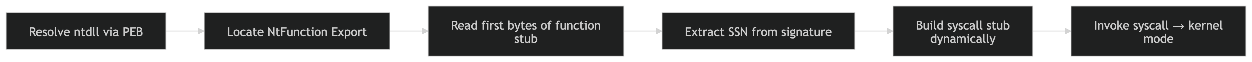 Hell’s Gate, introduced by am0nsec and RtlMateusz VX-Underground, laid the foundation for dynamic syscall resolution without relying on static (and easily fingerprinted) syscall IDs. Instead of hardcoding System Service Numbers (SSNs), the technique parses native function stubs inside ntdll.dll at runtime, extracting the actual SSN from the function’s first bytes.